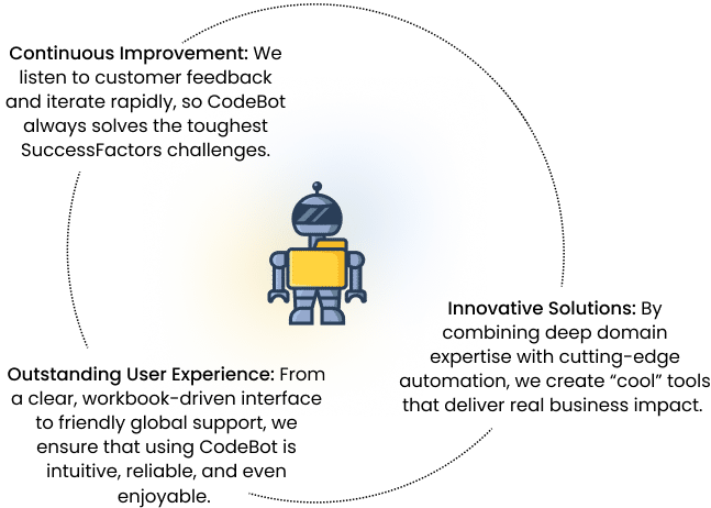 At CodeBot, we believe that every organization deserves a seamless, secure, and scalable way to manage their SAP SuccessFactors environment. Born from years of hands-on experience in HR technology, CodeBot was designed to automate tedious configuration tasks, eliminate manual errors, and empower teams to focus on strategic initiatives—rather than wrestling with spreadsheets and outdated processes.