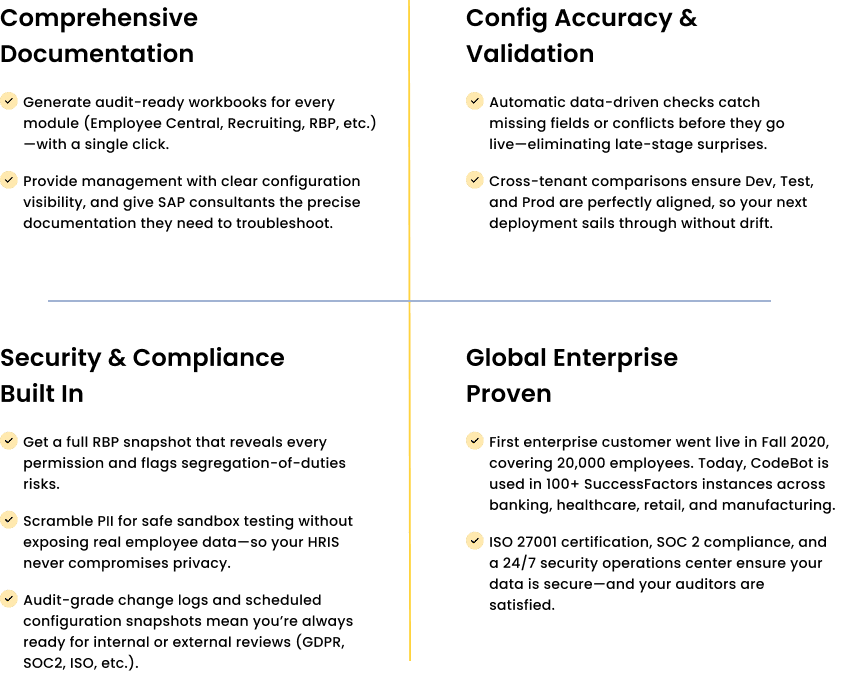 Our R&D team monitors SAP SuccessFactors releases weekly. We update CodeBot in lockstep with SAP’s bi-annual upgrades and patch releases to maintain full compatibility.