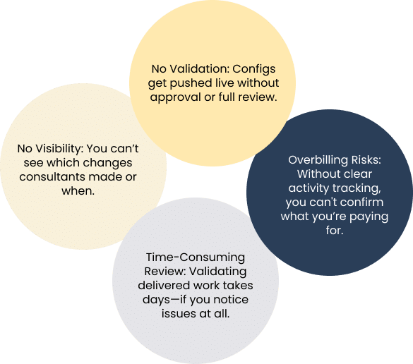 CodeBot tracks, analyzes, and reports on every configuration change—so you know exactly what your consultants are working on and whether it’s aligned to your expectations.
