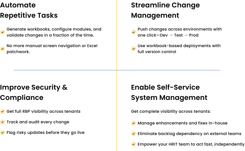CodeBot gives you the automation and visibility to manage SAP SuccessFactors faster, safer, and smarter—without relying on external consultants.